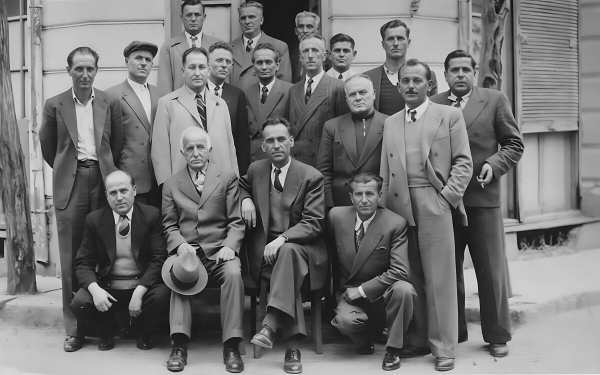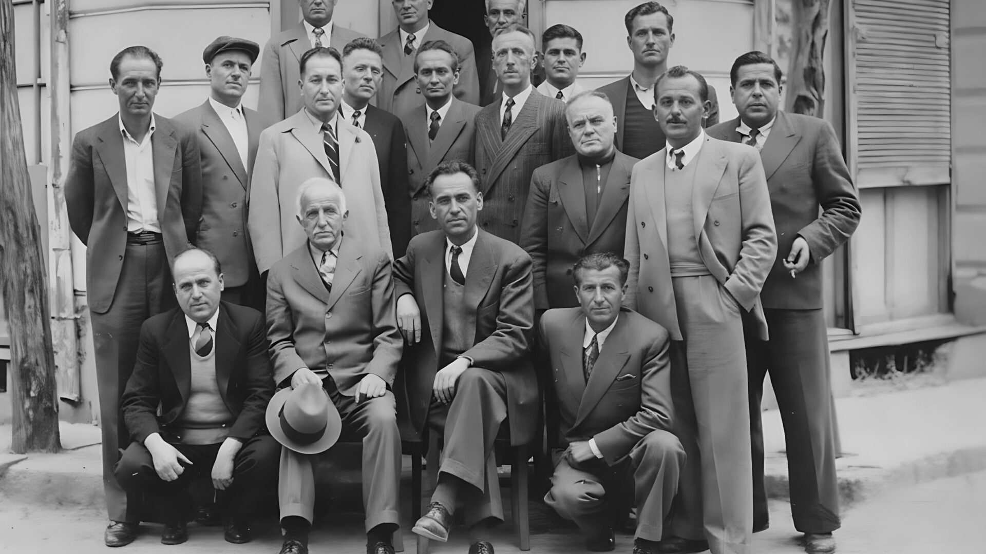 Από αριστερά καθήμενοι: Ιωάννης Παπαδημητρίου, γαλακτοπώλης, Γρηγόριος Κετσετζής, κατασκευαστής βαρελιών επί της οδού Στεφάνου Δραγούμη, λίγο πιο κάτω από το σπίτι της οικογενείας Μάντσου, Θεόδωρος Λούστας, ράπτης και πρόεδρος της Ομοσπονδίας, άγνωστος.