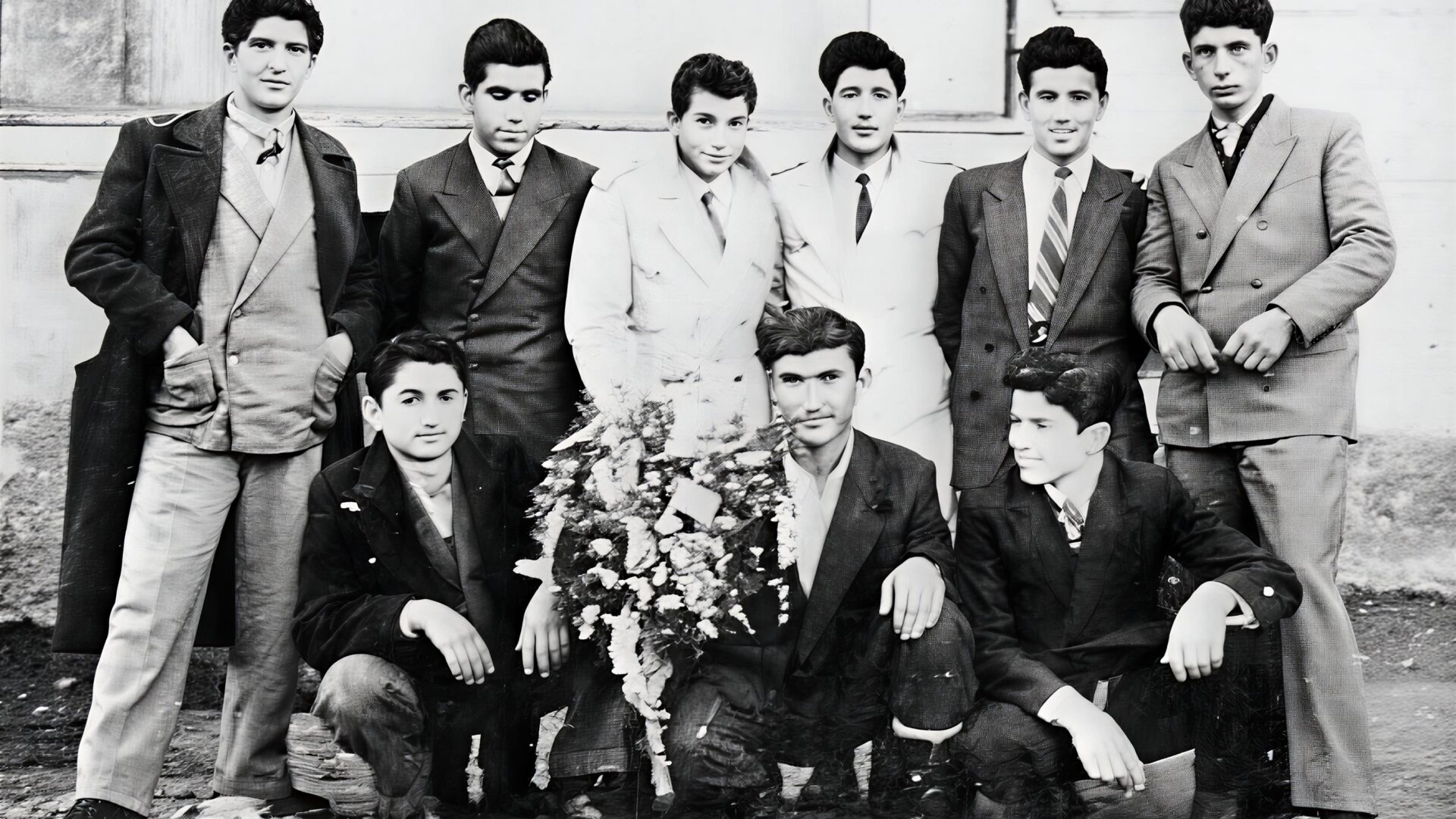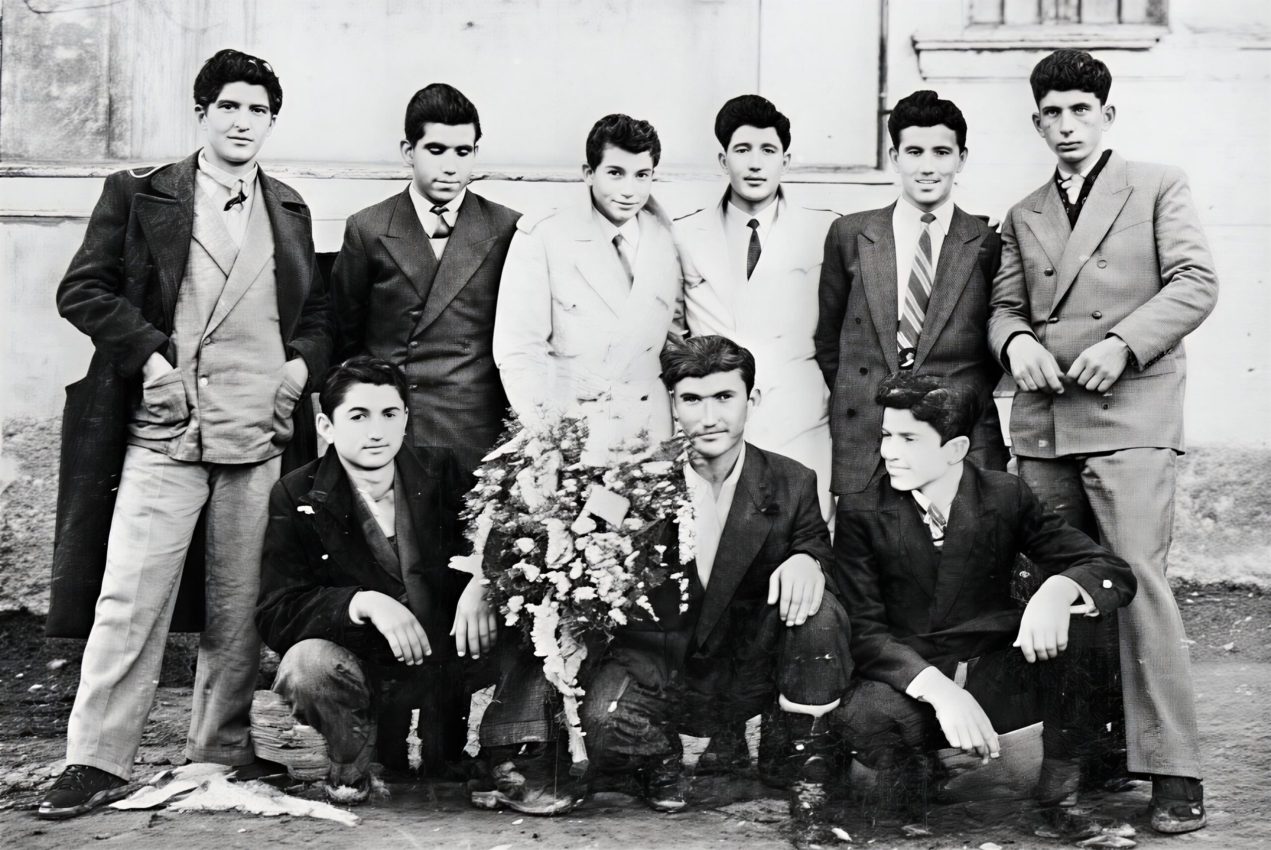 Πρωτοχρονιά 1952! Η εκλεκτή παρέα των εννέα φίλων, στήθηκε μπροστά στον φωτογραφικό φακό προκειμένου να υποδεχθεί τον καινούργιο χρόνο, να τον ατενίσει ελπιδοφόρα και να διανύσει τις 365 ημέρες του χαρούμενα, με υγεία και επαγγελματική επιτυχία.
