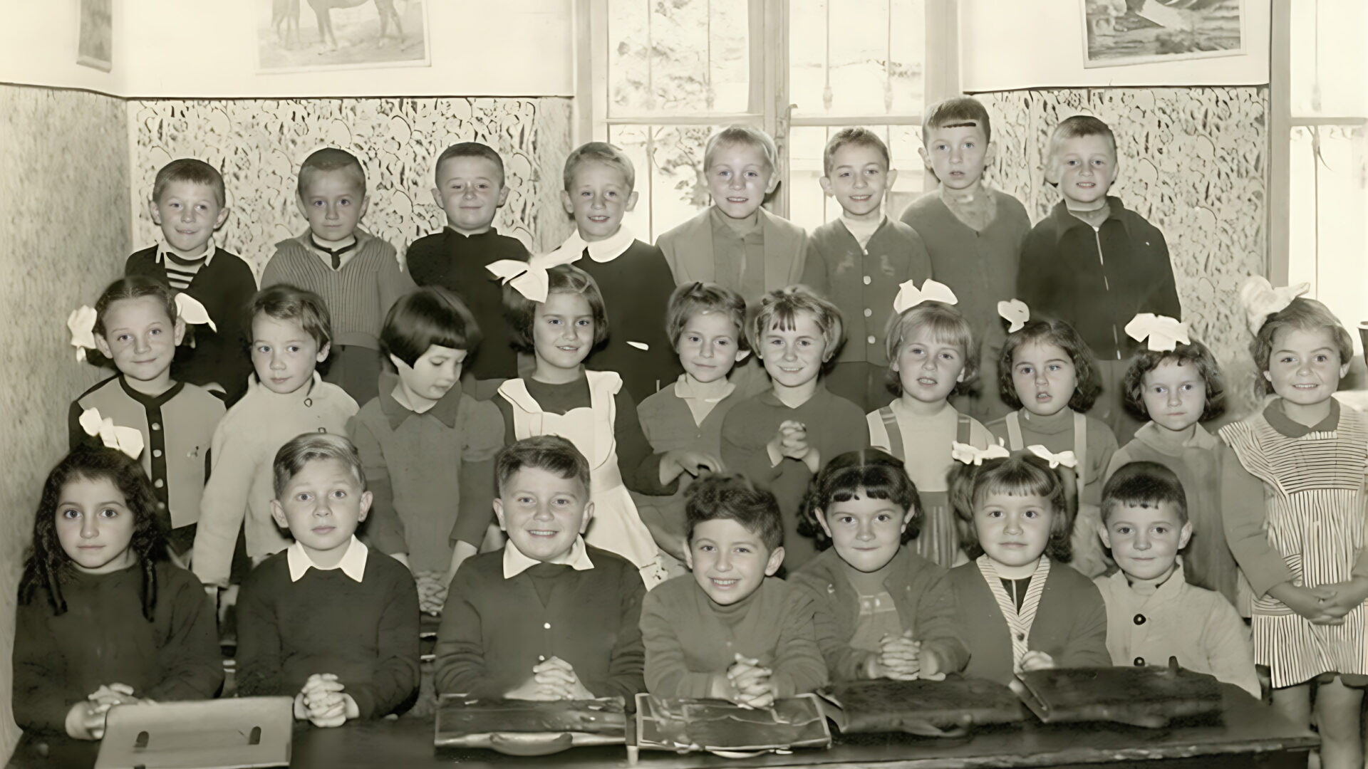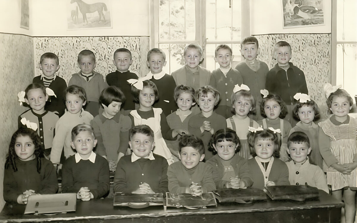 Στην πρώτη φωτογραφία η οποία είναι του σχολικού έτους 1955-56 διακρίνονται μαθητές και μαθήτριες του Νηπιαγωγείου από αριστερά προς τα δεξιά:
