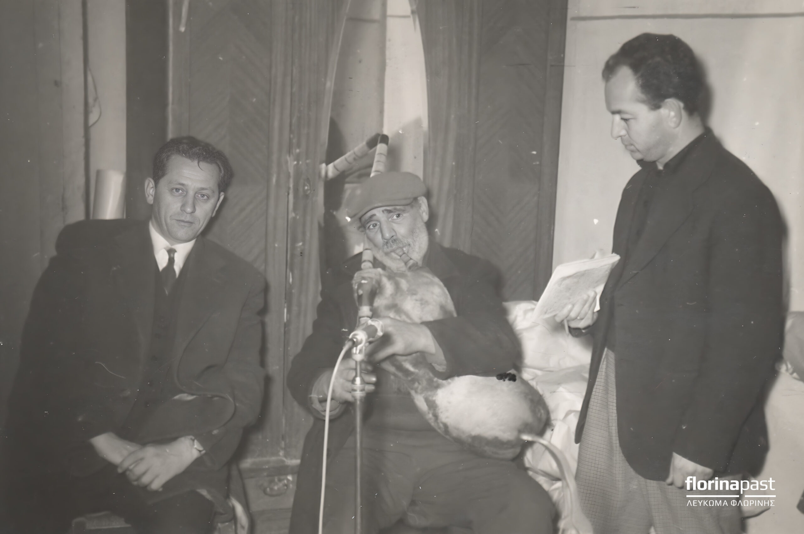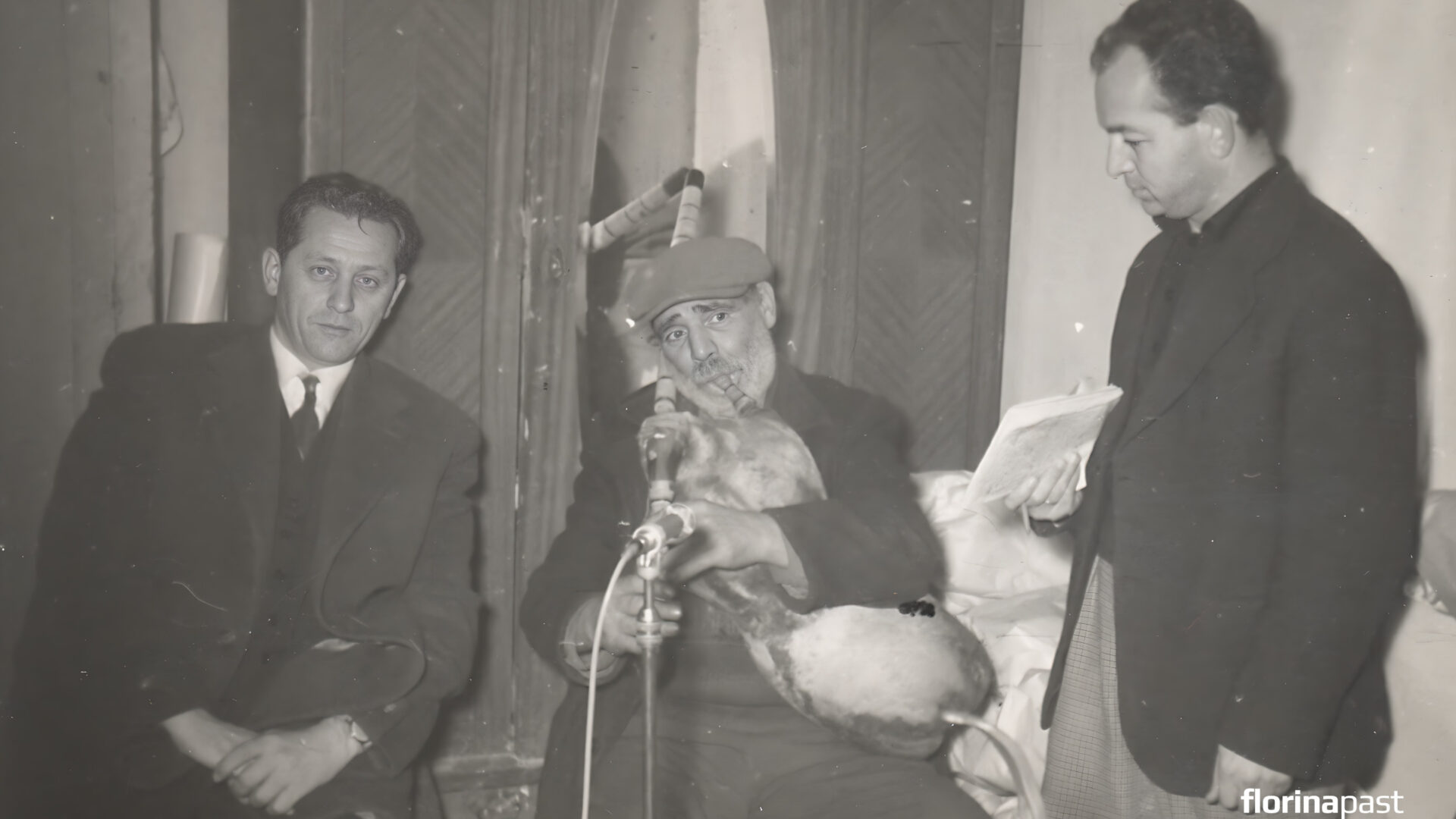 Πριν λίγες ημέρες με κείμενό του στο ιστολόγιο florineanews.blogspot.gr o Δημήτρης Μεκάσης μας έδωσε την ευκαιρία να γνωρίσουμε τον Έφτο, που έφτιαχνε γκάιντες και φλογέρες και έπαιζε με αυτές σε γάμους και σε ταβέρνες. Τότε ήταν που θυμήθηκα τις φωτογραφίες του γέρου με τη γκάιντα που είχα δει στο Ιστορικό Αρχείο του ΦΣΦΑ – συλλογή Γ. Θεοδοσίου. Ήταν ο Έφτος. Τις αναζήτησα και τις βρήκα. Ο Έφτος ηχογραφεί την μουσική της γκάιντάς του στις 3 Ιανουαρίου του 1961. Δίπλα του (αριστερά) ο τότε Δήμαρχος Φλώρινας Γεώργιος Θεοδοσίου ο οποίος φαίνεται ότι είχε την επιμέλεια της καταγραφής. Το επόμενο βήμα και η έκπληξη φυσικά θα είναι να ανακαλύψουμε και την μαγνητοταινία της «ιστορικής» εκείνης ηχογράφησης. Μέχρι τότε αρκεστείτε στην φυσιογνωμία του Έφτου και στο κείμενο του Δημήτρη Μεκάση το οποίο και αναδημοσιεύουμε.