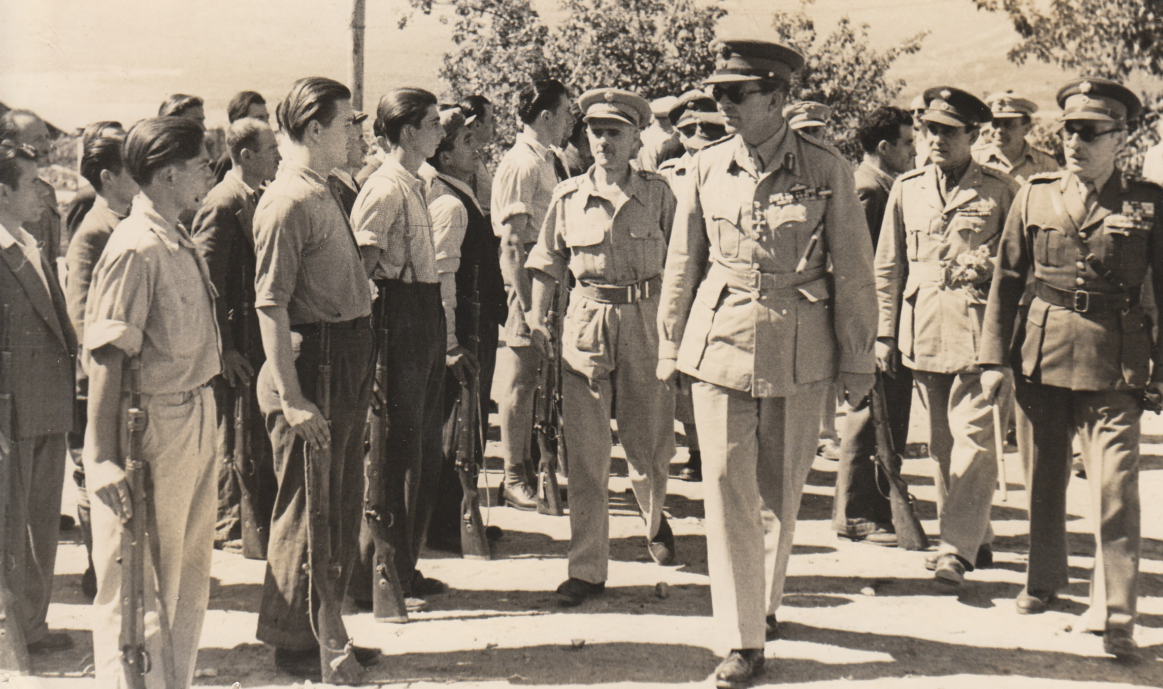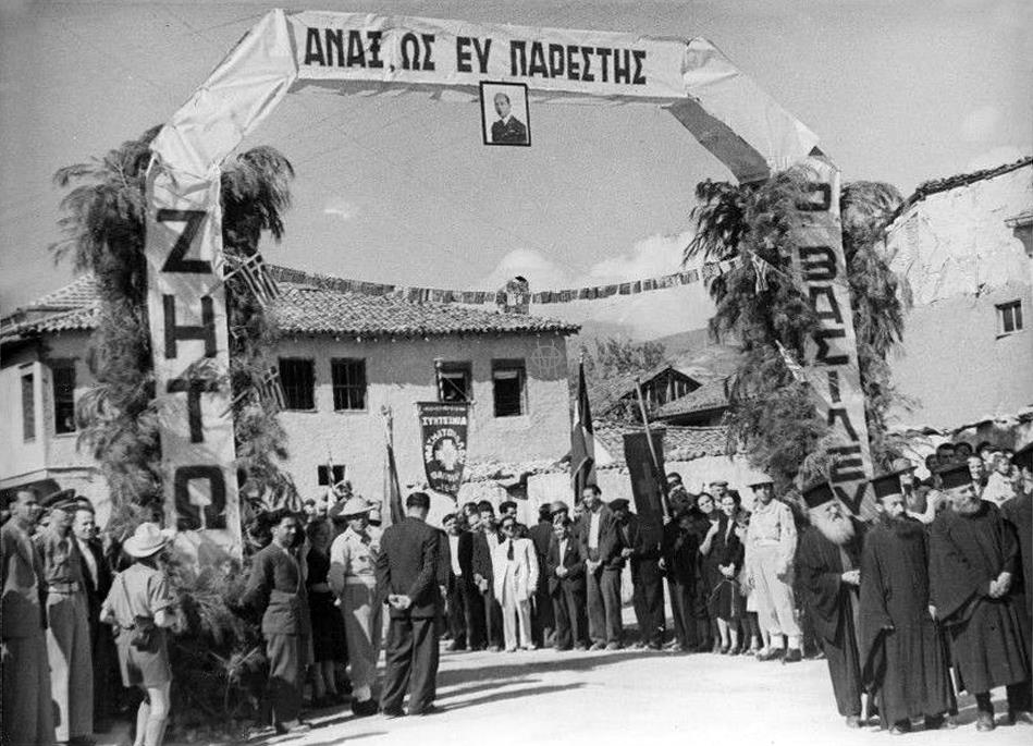 Οι Βασιλιάς Παύλος Α’, ο Αρχιστράτηγος Αλέξανδρος Παπάγος και οι επιτελείς συνοδευόμενοι από τις τοπικές αρχές βαδίζουν επί της Παύλου Μελά στην είσοδο της πόλης.