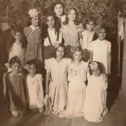 Ανάμεσα στους μαθητές και μαθήτριες είναι οι δάσκαλοι του Σχολείου: Βενιαμίν Αναστασιάδης (Βένος), Διευθυντής, όρθιος στην δεξιά πλευρά, δίπλα του η Σάρα Γυμνοπούλου – Παναγιωτίδου, στο κέντρο ο κ. Προκόπης Παπανούσης και η σύζυγός του Κούλα Μπέλλη, στην άκρη αριστερά η κυρία Φρόσω Κίτου – Απέργη.